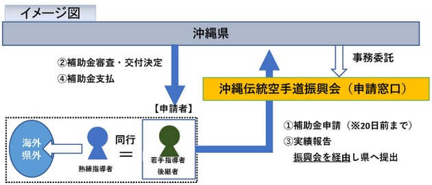 沖縄県では、海外又は県外の道場若しくは団体からの招聘により熟練指導者が自己負担無しで海外又は県外でのセミナー等を実施する際、若手指導者又は後継者が同行し熟練指導者のノウハウを継承するとともに、海外又は、県外の道場若しくは団体とのネットワークを構築・強化するため若手指導者又は後継者の渡航費を支援します。